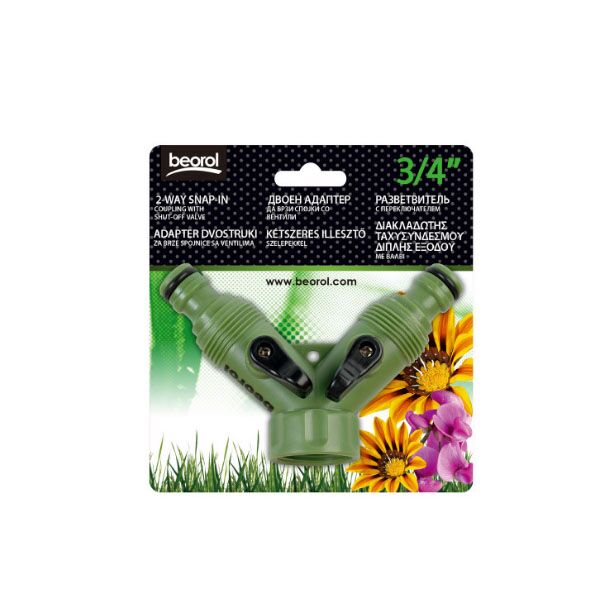 Dvostruki adapter izrađen od kvalitetne ABS plastike. Sastoji se od ulaznog 3/4” adaptera sa ženskim navojem i dva izlazna 3/4” muška brzo spojiva adaptera sa On/Off ventilima. Namenjen je za korišćenje u paru sa brzim spojnicama.