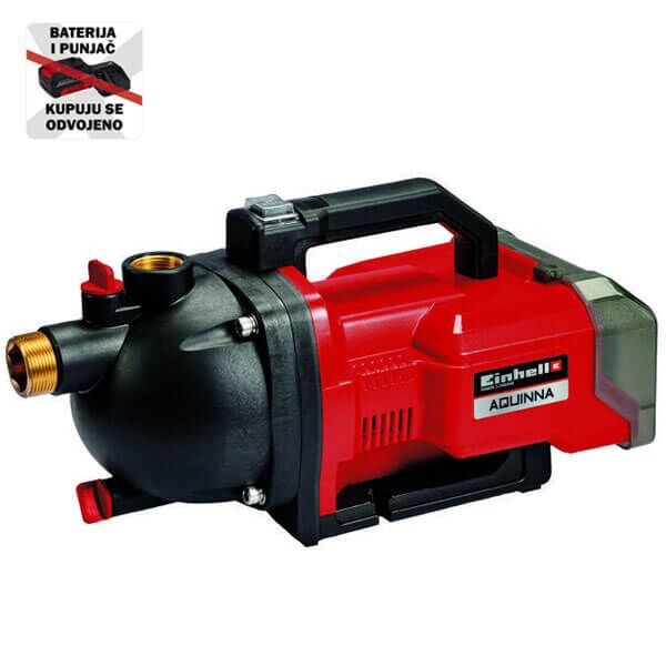 Pomoću bežične baštenske pumpe Einhell AQUINNA možete da koristite kišnicu i vodu iz bunara i cisterni u bilo kom trenutku u bašti i kućama, tako da štedite novac i zaštitite okolinu. Zato što baštensku pumpu AQUINNA napajaju dve 18 V punjive Power X-Change punjive baterije. Dizajnirane kao član porodice visokih performansi Power X-Change, sve punjive baterije iz sistemske serije mogu se fleksibilno i bez ograničenja koristiti u proizvodima za obradu i baštu iz sistemske serije. Za ispravno podešavanje postoji ECO sklopka sa dve postavke: bilo ekonomični režim sa smanjenim pritiskom isporuke ili punom snagom. Sa glavom za isporuku do 26 metara, visinom usisavanja do 8 metara i maksimalnom brzinom isporuke od 3.000 litara na sat, bežična baštenska pumpa AQUINNA takođe daje najbolje ocene za performanse. Priključak na dovodnoj strani je 42 mm (1 ¼”muški navoj), a na strani dovoda 33,3 mm (R1 ženski navoj). Postoji vijak za punjenje vode, a radi zaštite od mraza, vijak za odvod vode. baštensku pumpu možete odložiti u hladnoj sezoni bez ikakvih briga. Termostatski prekidač štiti motor od preopterećenja. Zahvaljujući praktičnoj ručici, bežična baštenska pumpa može se brzo preneti gde god je potrebno. Ovaj proizvod dolazi bez baterija ili punjača, dostupni su zasebno, na primer kao praktični starter set od Einhell-a.