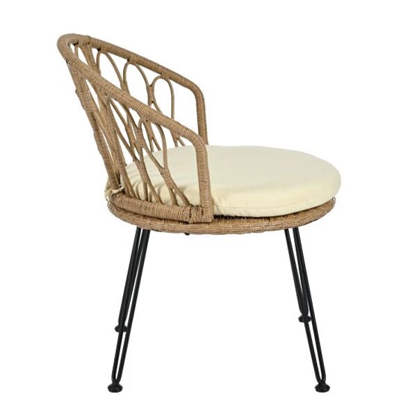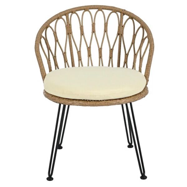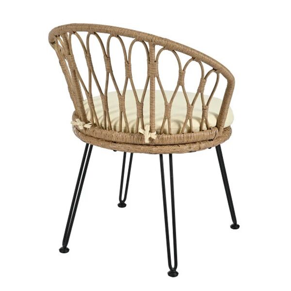 Stolica od ratana sa metalnim nogama kombinuje prirodni izgled i savremeni dizajn. Ručno pletena konstrukcija od ratana pruža čvrstinu i eleganciju, dok crne metalne noge sa zaobljenim završecima daju stabilnost i moderni akcenat. Udobno sedište sa jastukom omogućava dugotrajno sedenje, idealno za bašte, terase ili enterijere u boho, skandinavskom ili mediteranskom stilu.