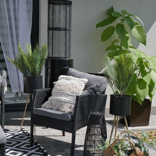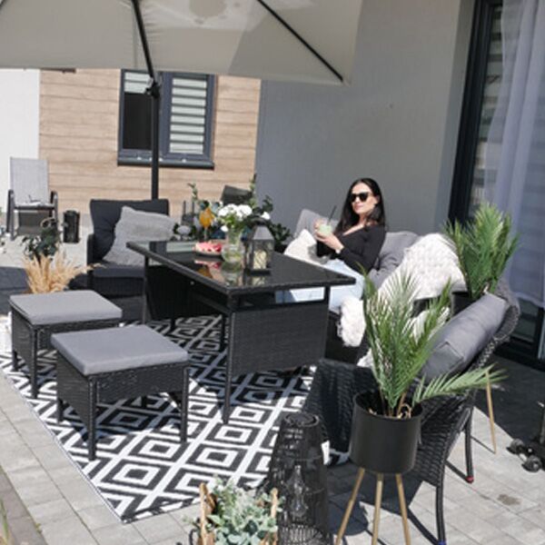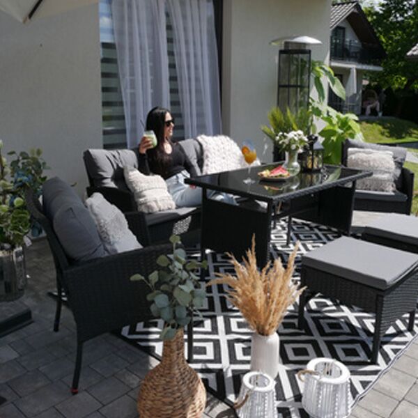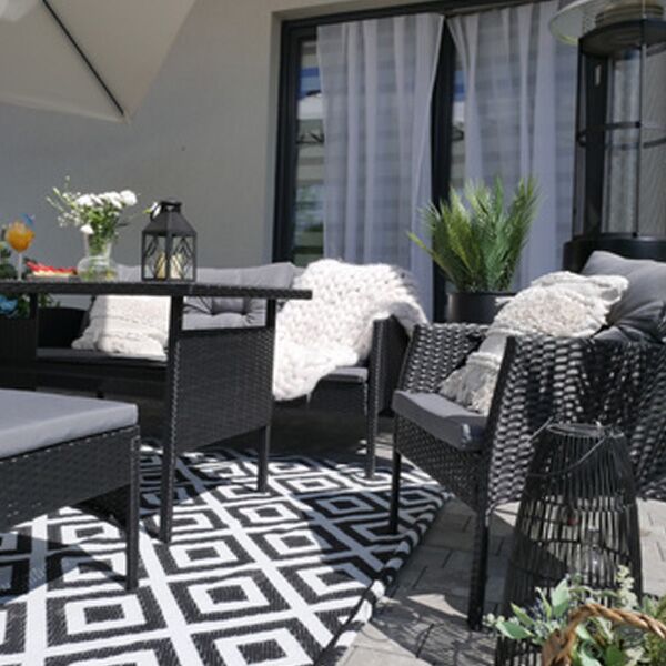 Moderan set nameštaja od ratana koji će se dobro uklopiti u baštu, na terasu ili balkon. Konstrukcija od pocinkovanog čelika garantuje izdržljivost i otpornost na vremenske uslove. Plastični ratan pruža elegantan izgled i lakoću održavanja. Udobni jastuci sa vodootpornom navlakom i patentnim zatvaračem povećavaju praktičnost korišćenja. Sto je opremljen kaljenim staklom, što celini dodaje moderan karakter.