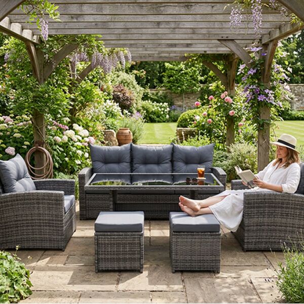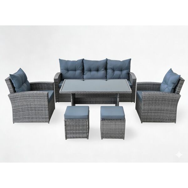 Ovaj elegantni set baštenskog nameštaja od tehnoratana savršen je za baštu, terasu ili dvorište. Njegov modularni dizajn omogućava fleksibilno raspoređivanje prostora, dok veliki, izdignuti sto pruža udobno mesto za obroke tokom porodičnih okupljanja i baštenskih zabava. Čvrst okvir od pocinkovanog čelika i vodootporni jastuci garantuju dugotrajnost i udobnost.