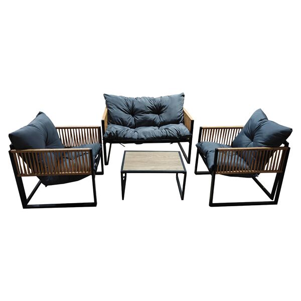 - Sto je upotpunjen pločom od čelika sa staklom debljine 5 mm u imitaciji drveta, dok jastuci debljine 8 cm sa punjenjem od rastresite vune i presvlakom od poliestera pružaju dodatnu udobnost pri korišćenju.
