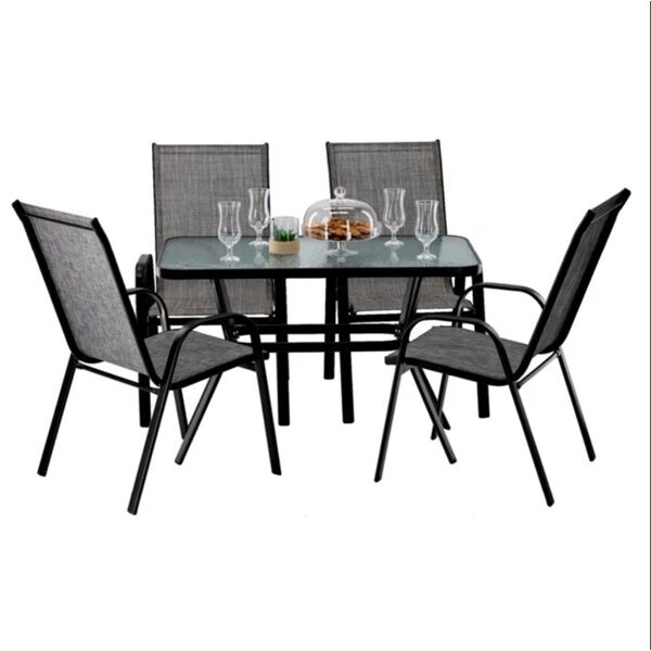 Garnitura baštenskog nameštaja u modernom i elegantnom stilu. Čelična konstrukcija obložena prahom čini set veoma izdržljivim. Sto ima ploču od kaljenog stakla sa mozaičkom teksturom. Sedišta su obložena vodootpornim tekstilnim materijalom, što ih čini udobnim, prozračnim i vodootpornim.