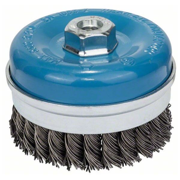 | Tekst proizvoda, AC siva | Lončasta četka – pletena žica Prikladna za teške radove čišćenja na metalnim površinama srednje do velike veličine, na primer za uklanjanje jake rđe ili zaštitne obloge donjeg dna vozila, skidanje boje ili laka. Za ugaone brusilice sa navojem M 10 ili M 14 Gewinde i za GGS 6 S Professional |