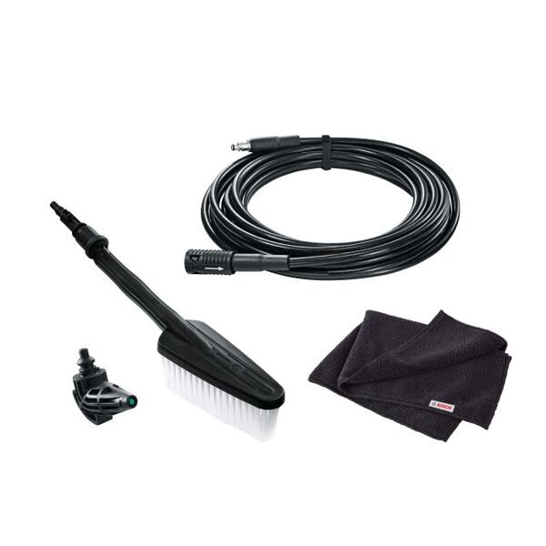 Ovaj set dodataka za perač se sastoji iz 4 dela: Produžno crevo od 6 metara, mlaznica pod 90°, četka za pranje auta i krpe za brisanje.