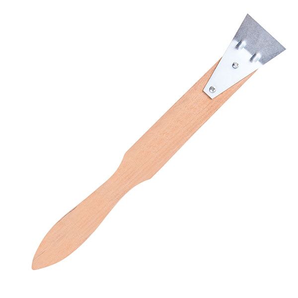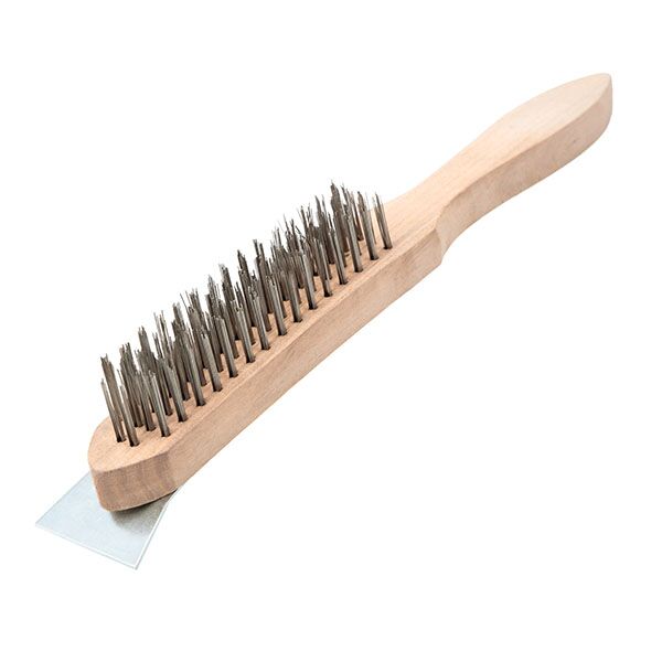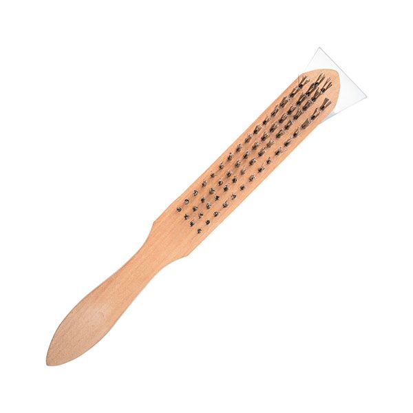 Četka sa strugačem za mehaničko odstranjivanje većih i tvrđih prljavština ili rđe. Čelična elastična žica, 4 reda žice, ručka od drveta.