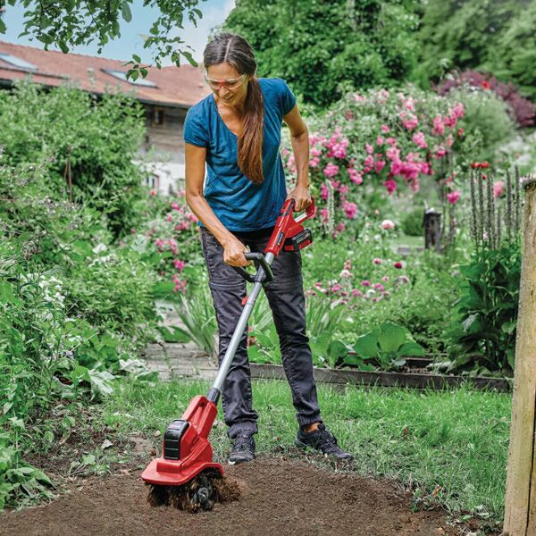 Akumulatorska kopačica Einhell GE-CR 18/20 Li E Solo nudi slobodu bežičnog rada kada treba da otpustite zemlju. Član je porodice Power X-Change, čije baterije se mogu koristiti sa preko 250 različitih Einhell alata i uređaja. Akumulatorska kopačica se može koristiti za mnoge zadatke u bašti. Pored toga što je savršeno sredstvo za pre i naknadnu pripremu baštenskih leja, može se koristiti za otpuštanje gornjeg sloja zemlje uz minimalan napor i u staklenicima. Pored toga, elektronski regulator brzine čini jedinicu još fleksibilnijom u pogledu potencijalnih primena. Četiri robusna noža kultivatora su napravljena od metala i obezbeđuju dug radni vek. Alat je lagan i ima glavnu ručku sa mekim rukohvatom – ne samo da je udoban za držanje, već vas neće prebrzo umoriti. Povrh ovoga, dodatna ručka takođe znači da svaki korisnik može individualno podesiti alat kako bi odgovarao svojim potrebama. Ručka za transport maksimizira pokretljivost alata, dok se duga ručka može podeliti na dva dela kako bi se uštedeo prostor kada se uređaj odlaže. Ovaj proizvod dolazi bez baterije ili punjača. Oni su dostupni zasebno, na primer kao praktičan Starter set od Einhell-a.