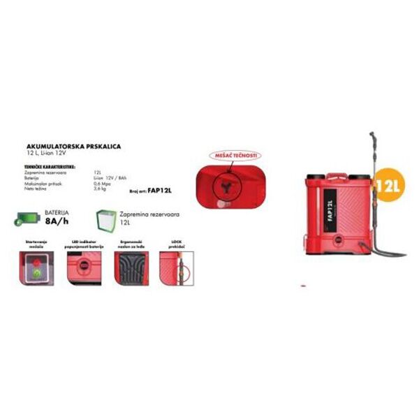 FARM Akumulatorska prskalica 12L FAP12L predstavlja savršeno rešenje za sve vaše potrebe prskanja u poljoprivredi i hortikulturi. Ovaj uređaj kombinuje modernu tehnologiju sa praktičnim dizajnom, omogućavajući vam da obavite posao brzo i efikasno.