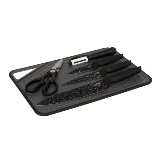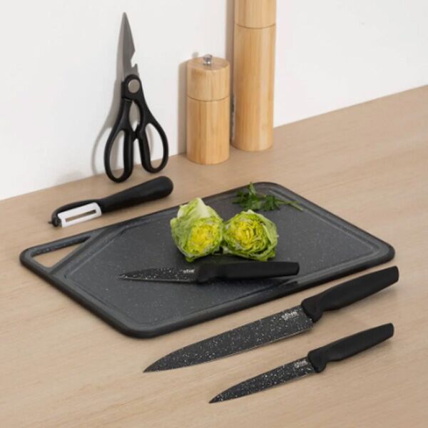 Daska za sečenje plus 3 noža plus ljuštilica i makaze u funkcionalnom setu koji bi svaka kuhinja trebalo da poseduje.