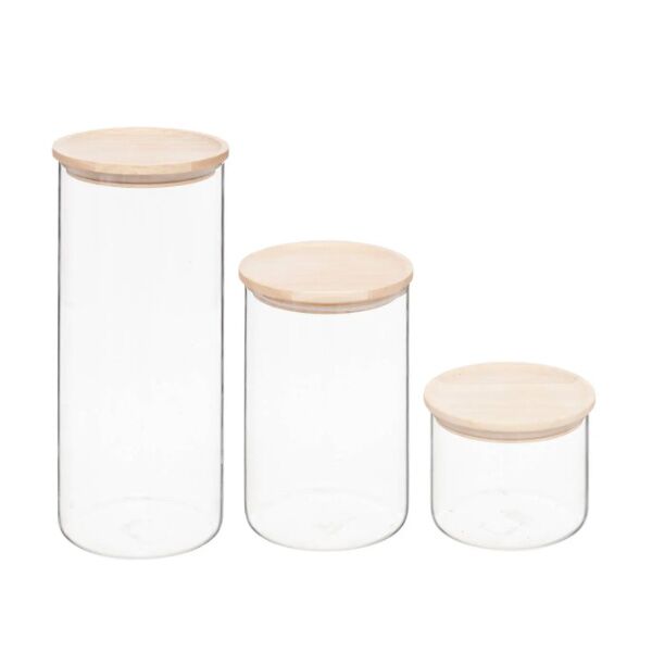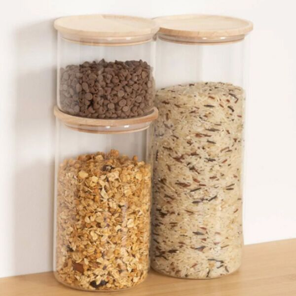 Set od tri staklene tegle različitih dimenzija sa drvenim poklopcima koje će savršeno služiti za organizaciju namirnica u kuhinji.