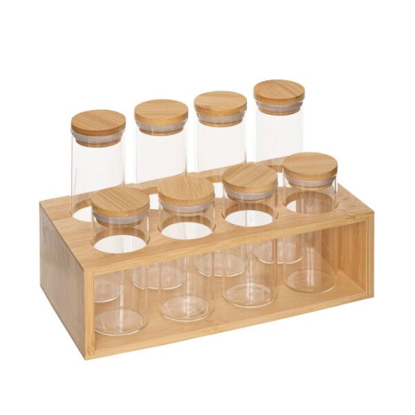 Praktičan organizator za začine sa osam staklenih teglica na postolju od bambusa. Kombinuje funkcionalnost i prirodni dizajn, čuvajući začine pregledno i lako dostupno, a ujedno dodaje estetski detalj svakoj kuhinji.