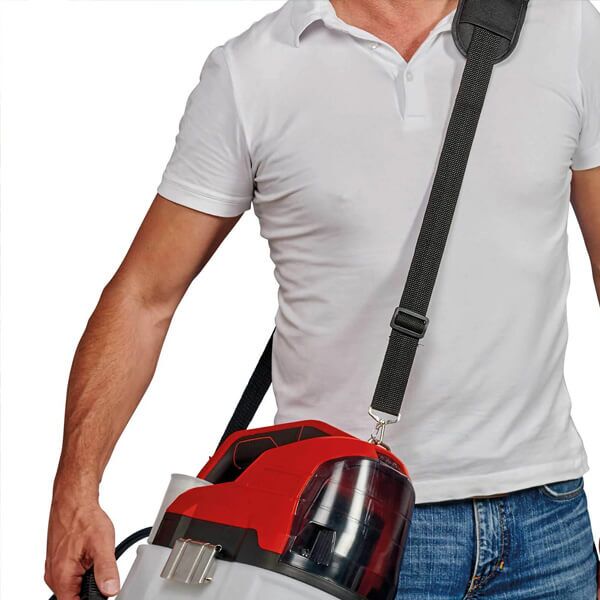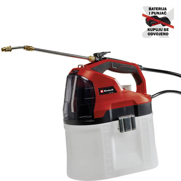 Einhell GE-WS 18/75 Li-Solo akumulatorska prskalica pod pritiskom je član Power X-Change porodice: svaka punjiva baterija u ovoj seriji se može kombinovati sa svakim PXC uređajem. Prskalica pod pritiskom je praktična pomoć za bujno zelenilo u bašti koja takođe omogućava ravnomerno raspršivanje sredstava za zaštitu bilja, djubriva i sredstava za suzbijanje korova. Ova prskalica pod pritiskom ima automatsku pumpu koja radi na 2,5 bara i izbacuje do 1 litra po minutu – ne treba da ručno pravite pritisak. Skala u providnom rezervoaru pokazuje nivo napunjenosti rezervoara od 7,5 litara, vidljiv na prvi pogled. Velike metalne ručke na rezervoaru su dizajnirane da učine otvaranje i zatvaranje lakim. Mesingana mlaznica za rspršivanje je podesiva po potrebi. Teleskopska cev je napravljena od nerđajućeg čelika i opremljena kontrolnim dugmetom koje se može zaključati. Obložen kaiš za nošenje olakšava nošenje i korišćenje prskalice tokom rada. Poklopac baterije pruža zaštitu od prskanja vode. Punjiva baterija i punjač su dostupni posebno, na primer kao praktični starter set.