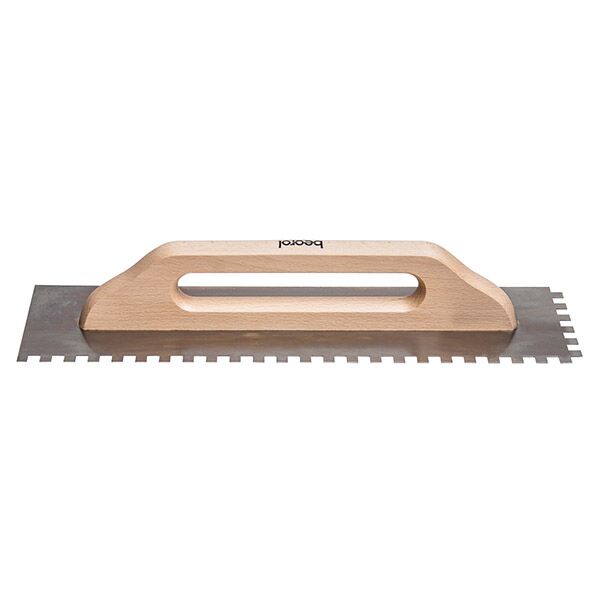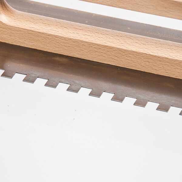 Nazubljena gleterica od nerđajućeg čelika za nanošenje lepka i drugih žitkih građevinskih materijala na veće površine. Otporna na hemijske uticaje.