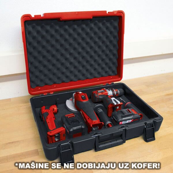 Einhell S55 E-Kofer održava sve urednim i čistim i omogućava mobilnost. E-Kofer S35 uvek je spreman za rukovanje, uvek dobro raspoređen, posebno dizajniran za skladištenje alata i pribora za opštu namenu. Stres od traženja alata i njihovog pribora je prošlosti. Sve je spremljeno uredno, uredno i spremno za upotrebu, i može se lako prevesti gde god je potrebno. To je obezbeđeno ergonomskom drškom za udobno nošenje. Kofer ima maksimalnu nosivost od 30 kilograma. Zahvaljujući dizajnu zaštićenom od prskanja, sadržaj je uvek sigurno zaštićen bez obzira da li se nalazi u fradionici, prtljažniku automobila ili na licu mesta. Takođe, meka penasta unutrašnja obloga garantuje zaštitu od ogrebotina tokom transporta. Ovo takođe obezbeđuje zaštitu Einhell alata – za dug radni vek.