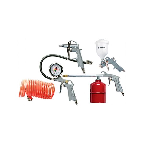Univerzalni komplet napravljen je od visokokvalitetnog materijala. Koristi se za farbanje, pranje, ribanje i pumpanje guma. Koristi se kako u domaćinstvu (garaže, radionice), tako i u profesionalnim (autoservisi, proizvodnja nameštaja, manje fasaderske aktivnosti). Pogodno za sve pneumatske kompresore. Komplet poseduje crevo od 5 metara za povezivanje velike brzine.