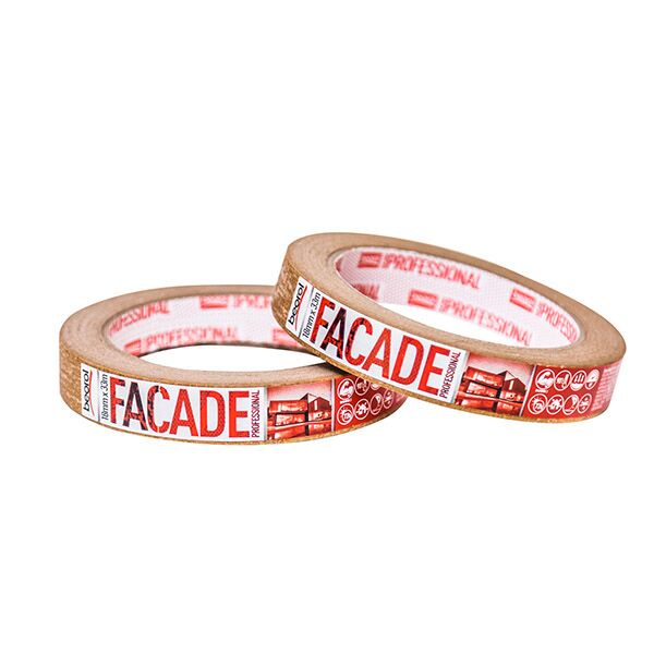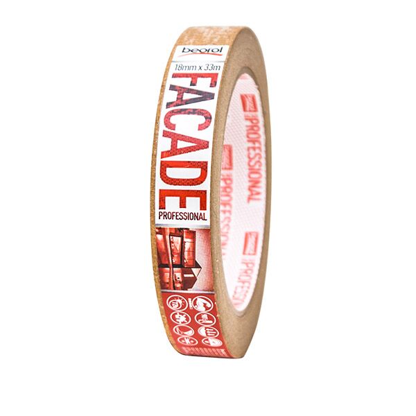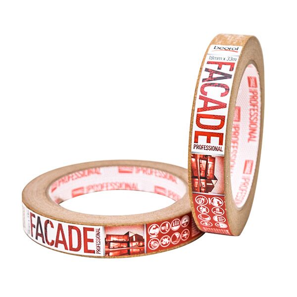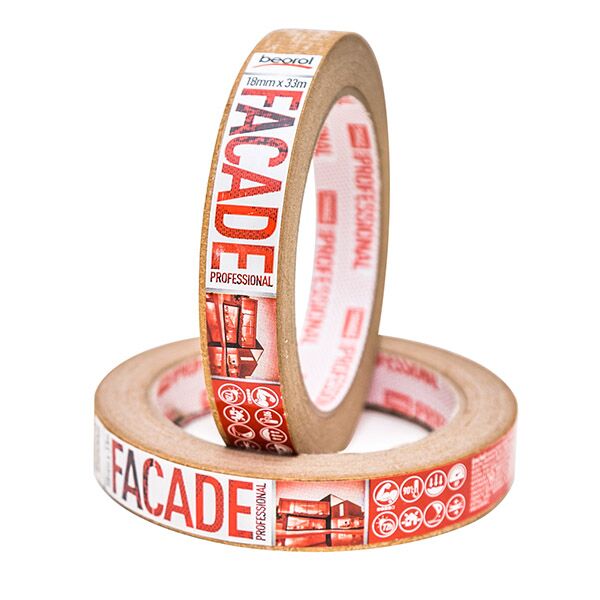 Krep traka Facade Professional je namenjena za spoljašnju upotrebu. Vrsta lepka: Solvent (prirodni kaučuk), u ukupnoj debljini trake od 145μm. Namena trake je zaštita površina prilikom izrade fasada, kao i razne druge aplikacije koje se rade na otvorenom. Preporučuje se korišćenje na raznim vrstama površina (zid, gips-karton, drvo, PVC, metal). Napredan nivo jačine lepljenja. Preporučena satnica skidanja sa površine je 72h. Otpornost na kidanje. Ne ostavlja tragove lepka. Otpornost na temperaturu do 90 ᵒC. Boja: Braon. Širina 18mm.