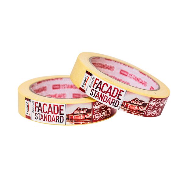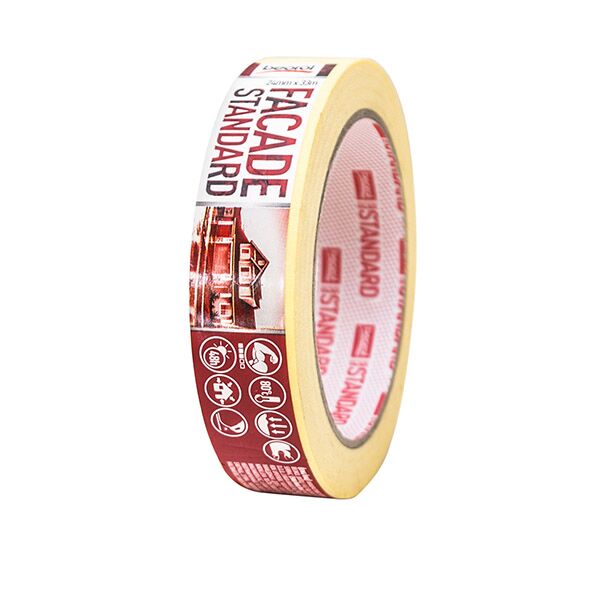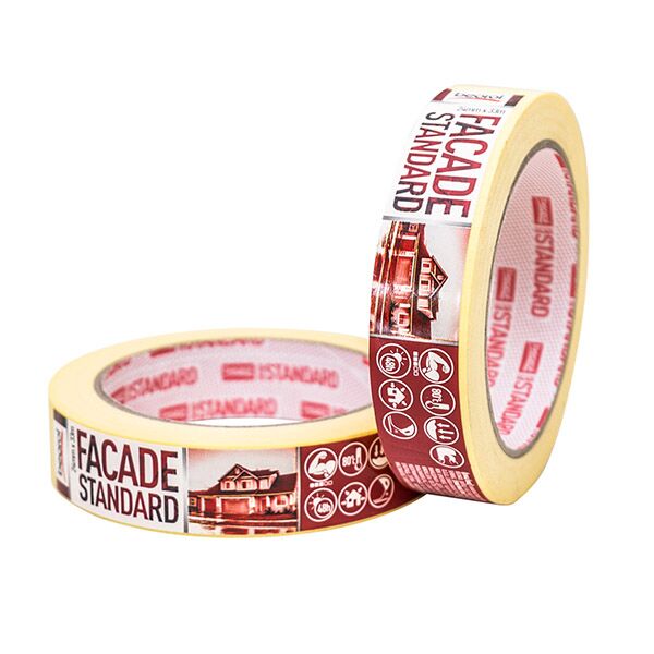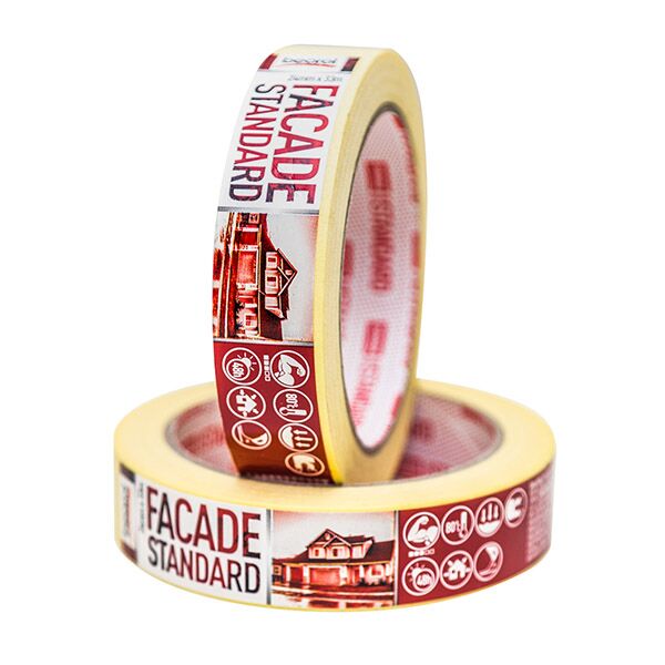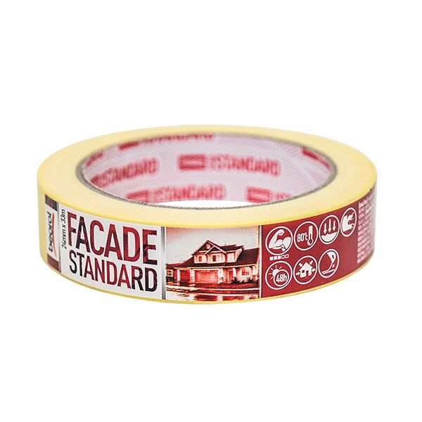Krep traka Facade Standard je namenjena za spoljašnju upotrebu. Vrsta lepka: Solvent (prirodni kaučuk), u ukupnoj debljini trake od 145μm. Namena trake je zaštita površina prilikom izrade fasada, kao i razne druge aplikacije koje se rade na otvorenom. Preporučuje se korišćenje na raznim vrstama površina (zid, gips-karton, drvo, PVC, metal). Standardni nivo jačine lepljenja. Preporučena satnica skidanja sa površine je 48h. Ne ostavlja tragove lepka. Otpornost na temperaturu do 80 ᵒC. Boja: Žuta. Širina 24mm.