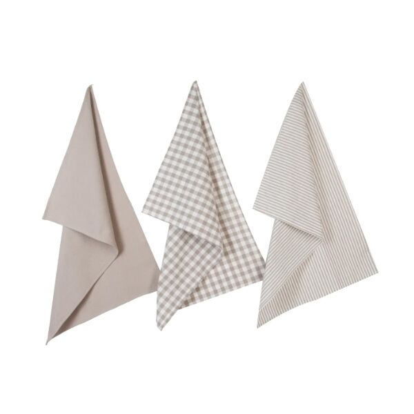 Set od tri kuhinjske krpe u bež boji sa različitim dezenima.