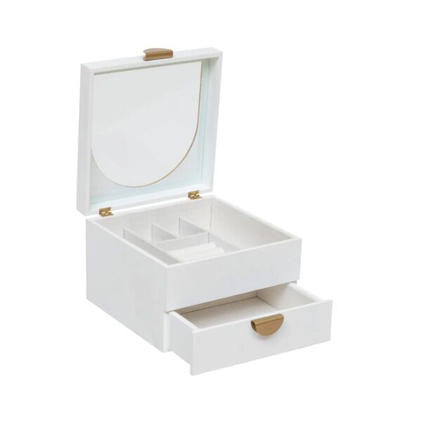 Moderna kutija za nakit bele boje sa zlatnim detaljima, idealna i za putovanja zbog svojih dimenzija.