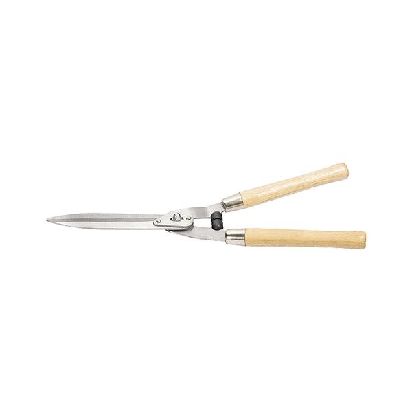 Makaze za grmlje s drvenim ručkama i valovitim sečivima. Dizajnirane su za oblikovanje krošnje drveća i grmlja i rad sa grančicama promera do 10 mm. Valovite oštrice dodatno drže granu tokom rada. Čvrsti amortizer služi kao ograničenje poteza kontrakcije, istovremeno ublažavajući zaustavljanje alata i sprečavajući ga da se pokvari. Oštrice su napravljene od U8 alatnog čelika i oštrene su. Drvene drške zaštićene su od sušenja bezbojnim lakom.