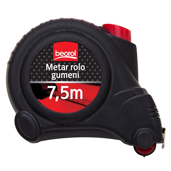 Metar rolo gumeni 7.5m je napravljen od visoko kvalitetne plastike obložene gumom. Mogućnost jednoručnog izvlačenja merne trake pomoću rolo gumenog valjka. Automatsko stop dugme zadržava mernu traku i pruža jednostavnost prilikom korišćenja. Pritiskom na njega kontrolišemo povraćaj trake, što sprečava pucanje i moguće povrede prstiju, a ujedno može i da zaustavi traku na željenom mestu.