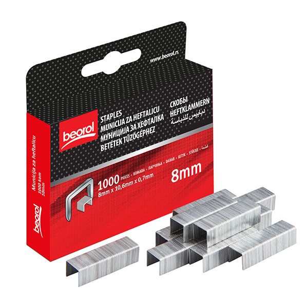 Municija za heftalicu 8mm, različitih dubina zakucavanja. Pakovanja sadrže po 1000 komada. Odgovaraju heftalici HFT.