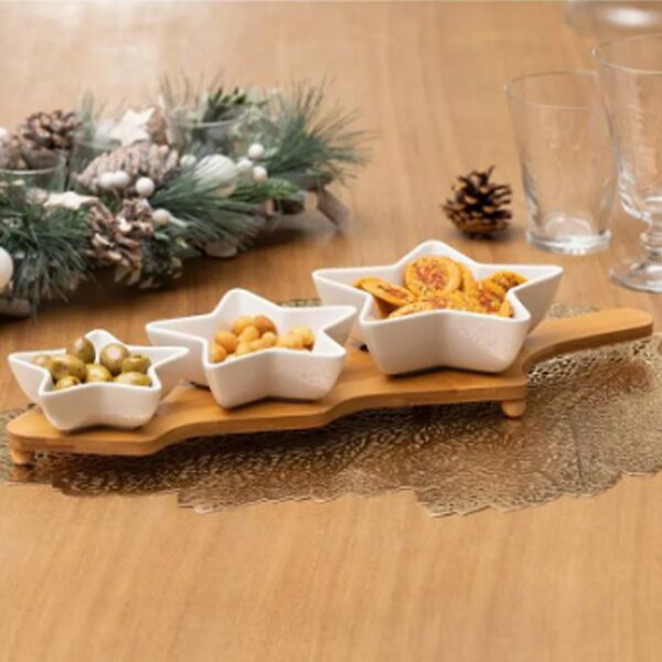 Dekorativni set od tri zvezde savršen je dodatak prazničnoj trpezi. Može se koristiti za serviranje sitnih zalogaja ili kao ukrasni detalj koji unosi svečanu notu u dom. Kombinuje eleganciju i toplinu novogodišnjeg dekora.