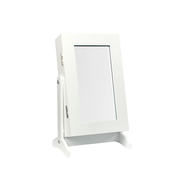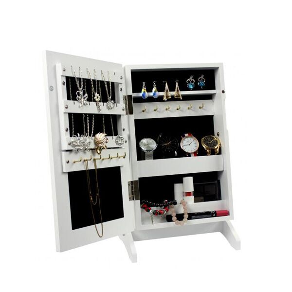 Ormarić za nakit sa ogledalom je svakako odlična ideja za poklon za svaku ženu. Sadržaće veliki broj ogrlica, prstenja, narukvica i satova . Tapaciran enterijer dodaje šarm i eleganciju, a spoljašnje ogledalo je, kao što svi znaju, obavezno u svakoj spavaćoj sobi.