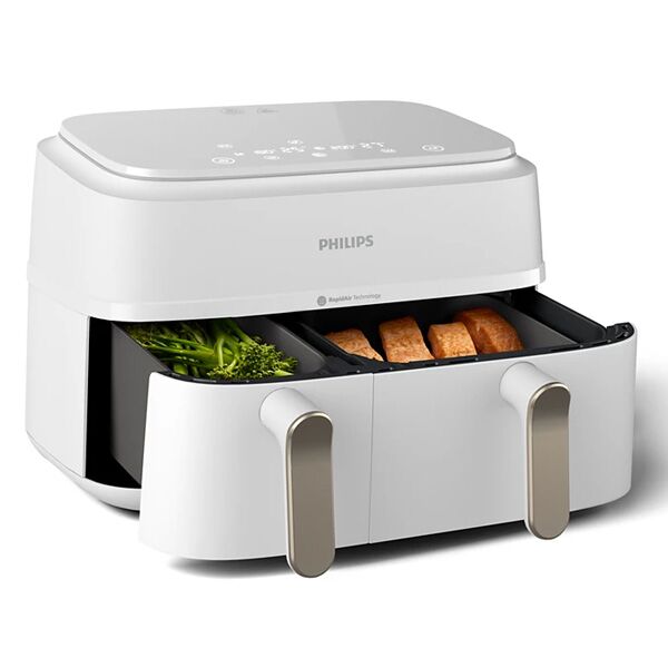 Model Philips NA353/10 iz serije 3000 predstavlja multifunkcionalni „airfryer” sa dve nezavisne korpe — korisnik može istovremeno pripremiti glavno jelo i prilog, bez mešanja ukusa i sa optimalnom temperaturom za obe komponente. Napredni digitalni ekran i unapred podešeni programi čine upotrebu jednostavnom, a zahvaljujući patentiranoj tehnologiji Rapid Air Plus, hrana ispada hrskava spolja, mekana iznutra, uz znatno manju količinu ulja. Idealan je za porodičnu pripremu zdravijih jela bez previše komplikacija.