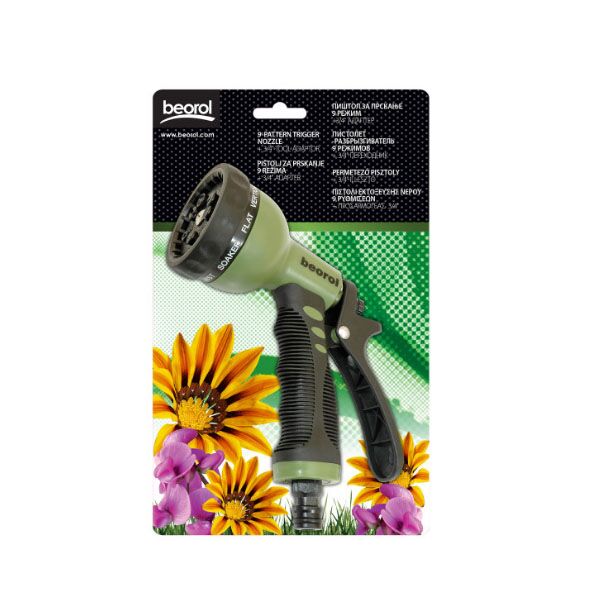 Pištolj za prskanje sa 9 režima i adapterom 3/4″. Telo napravljeno od kvalitetne ABS plastike, visoko otporno na udarce i padove. Poseduje metalnu zaštićenu ploču za kontrolu mlaza. Radi lakšeg i udobnijeg rada, rukohvat je gumiran i ergonomski oblikovan. Pištolj ima više režima rada radi boljeg prilagođavanja prskanja poslu koji se obavlja i površini koja se prska.