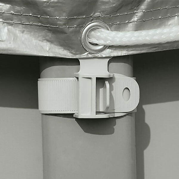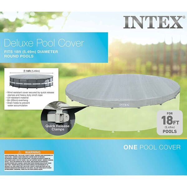 Za bazene Intex Ultra Frame od 18 stopa, ovaj poklopac ima prepust od 8 inča, uže za zatezanje da poklopac ne bi oduvao, rupe za odvod koji sprečavaju akumulaciju vode i materijal otporan na UV zračenje koji ga štiti od izbledenja.