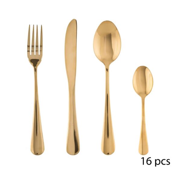 Pribor za jelo, set od 16 delova u zlatnoj boji, moderan dizajn za svečano postavljanje stola.