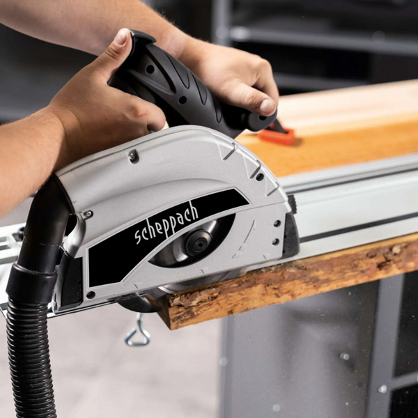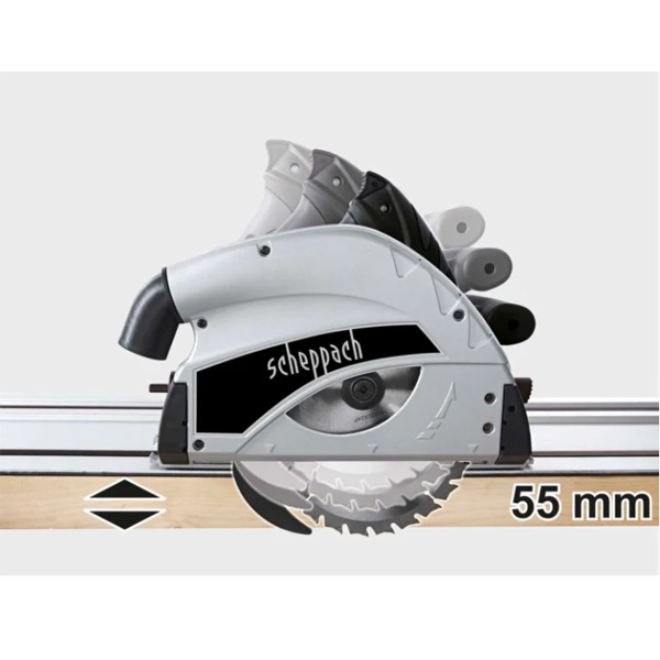 Opseg bezstepenog okretanja omogućava rezove od 0° do 45°. Zaštita od prevrtanja drži TAS55-BE sigurno na šini i pod željenim uglom. Pod uglom od 45°, maksimalna dubina rezanja je 41 mm. List testere od 160 mm sa 24 zuba pogodan je za tvrdo prirodno drvo, ivericu, šperploču kao i za MDF i dvostrano obložene ploče. Integrisana zaštita od krhotina osigurava ivice bez krhotina.