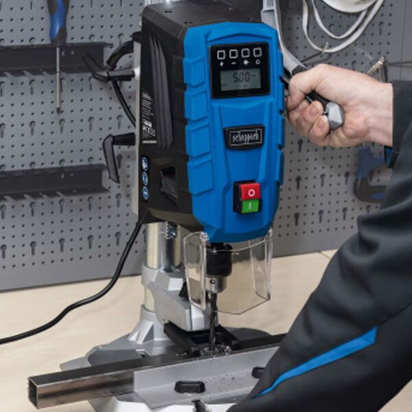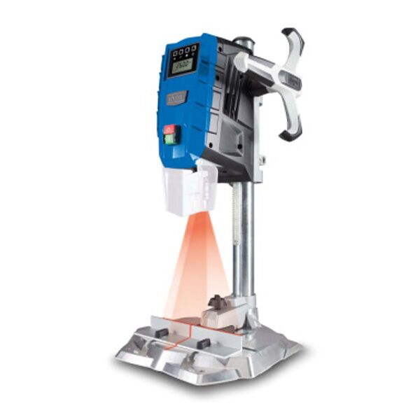 Stubna bušilica Scheppach DP55 ima digitalni ekran za podešavanje brzine od 500 do 2600 o/min, brzo stezanje burga u preciznoj glavi, i integrisani laser za tačno bušenje.