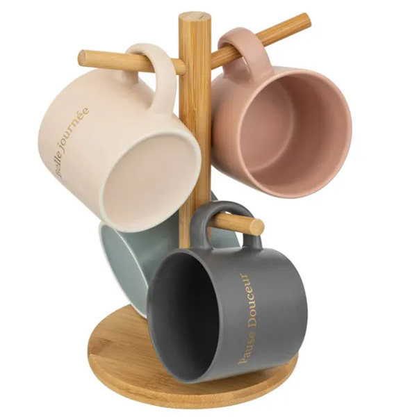 Ovaj stalak dolazi sa četiri šolje zapremine 20 cl i pruža praktično i dekorativno rešenje za serviranje pića. Šolje su dizajnirane u elegantnom Belle stilu, a stalak omogućava uredno i stabilno odlaganje. Idealno je za kafu, čaj ili druga topla/pića za posluženje gostima.