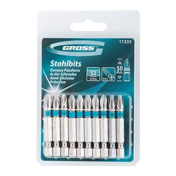 Set bitova marke GROSS dizajniran je za upotrebu kao pokrivači za glavu u automatizovanim i ručnim alatima. Nastavci su napravljeni od visokokvalitetnog alatnog čelika, razreda S2. Tvrdoća bita je 58-62 HRS. Jezgro bita je šesterokutna drška, veličine 0,6 cm (1/4 “). Dužina nastavka je 50 mm, tip udubljenja – PH2 (Phillips).