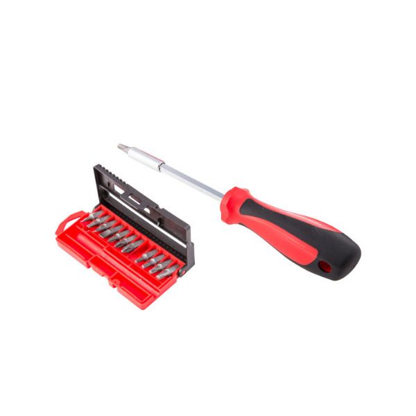 Set odvijača sa nastavcima 13 komada, sa račnom i izmenjivim vrhovima. Izrađen od visokokvalitetnog CrV čelika. Drška ergonomskog oblika omogućava brži i lakši rad.