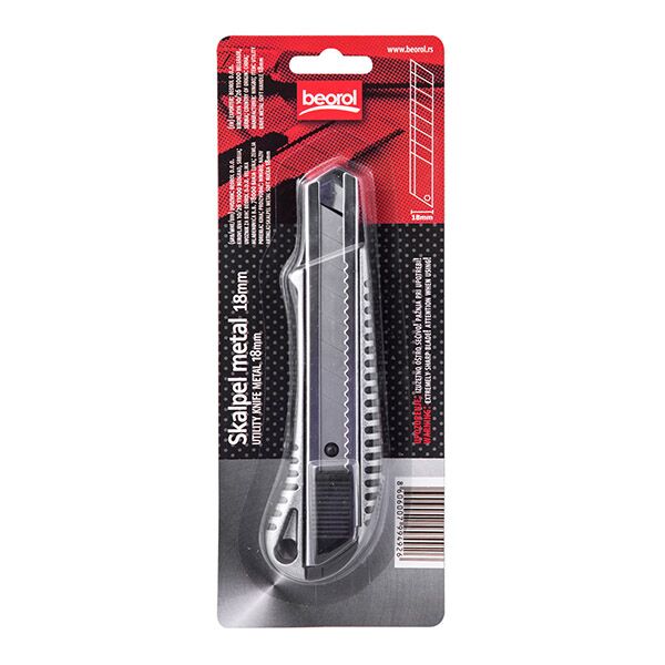 Kvalitetan skalpel sa metalnim vođicama i metalnim ergonomskim rukohvatom. Izuzetna čvrstina skalpela omogućava majstoru da završi i najzahtevnije poslove sečenja. Koristi lomljiva sečiva.