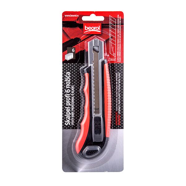 Profesionalni skalpel sa gumiranim metalnim kućištem, što mu daje čvrstoću i bolje prijanjanje u ruci. Namenjen zahtevnim radovima, sa mogućnošću štelovanja sečiva u koraku. U telu skalpela se nalazi šaržer sa 6 kvalitetnih sečiva od 18mm. Koristi lomljiva sečiva od 18mm.