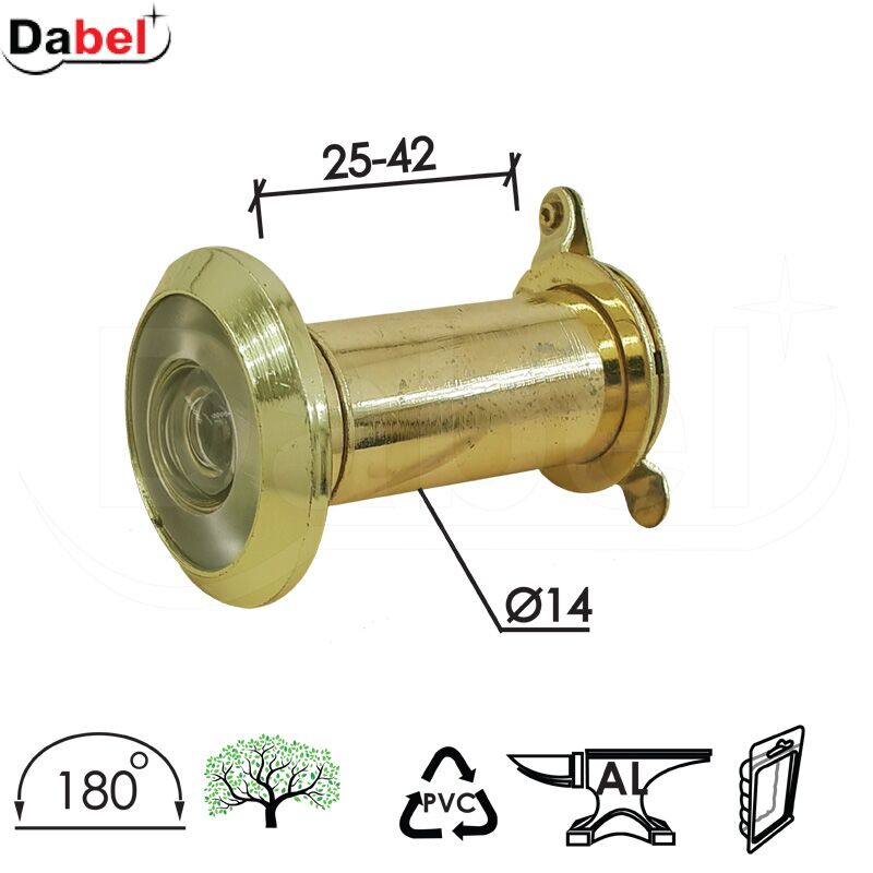 DABEL- Špijunka za vrata ŠP4000- Materijal: Zamak- Boja: Mesingana.Upotreba: drvo/pvc/alu.