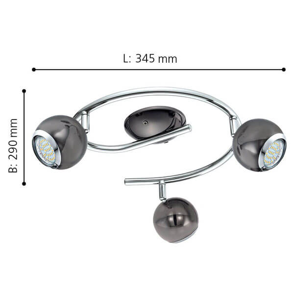 Materijal: čelik, nikl-crna, hrom Visina artikla (u mm) 345, Dužina artikla (u mm) 290, Neto težina (u kg) 0,87 Tehnologija: LED – HV Maksimalna snaga: 3X2,8W WARM WHITE Vrsta prekidača: bez prekidača