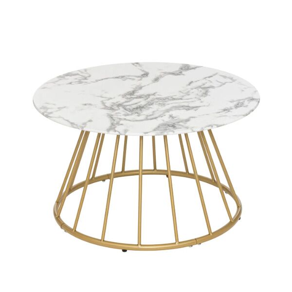 Moderan elegantan stočić za kafu u belo sivoj boji sa detaljima sličnih mermeru sa zlatnim postoljem.