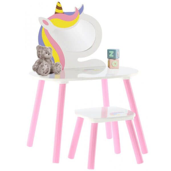 Beli toaletni stočić sa šarom duge od punog drveta je savršen komad nameštaja za svaku devojku. Toaletni sto će raditi kao mesto gde će vaše dete stvarati neverovatna umetnička dela. Ovde će vaša ćerka početi da razvija svoju kreativnost. Set uključuje stolicu sa duginim uzorkom. Noge su od borovog drveta, a sedište od medijapana. Dimenzije kompleta su savršene za decu od oko 3 godine.
