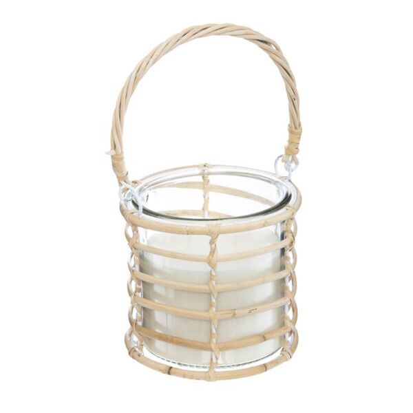 Sveća u staklenoj posudi – 14.5×13.5 cm, vosak/staklo/ratan, bež, za unikatne dekorativne trenutke.