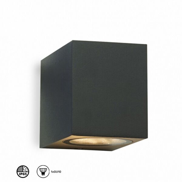 Spoljna svetiljka, tamno sive boje, IP65 zaštita. Poseduje jedno sijalično grlo, tip GU10. Izrađena je u obliku kvadra, elegantnog dizajna, od aluminijuma sa odličnom završnom obradom. Idealna je za postavljanje na fasade stambenih i industrijskih objekata, na terasama i u dvorištima.