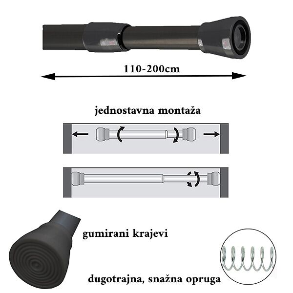 Tendance držač za zavese za kadu 110-200 cm AL crna – crni aluminijumski držač za zavese sa prilagodljivom dužinom.