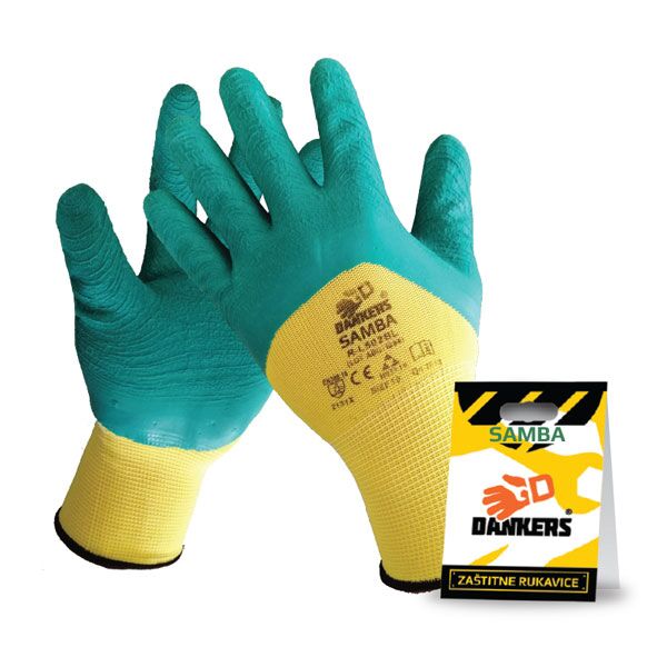 Rukavice žute boje sa nanosom naboranog lateksa zelene boje na dlanu i prstima, koji se prostire do polovine nadlanice, i elastičnom manžetnom. Pružaju dobar stisak grubih i teških abrazivnih predmeta.